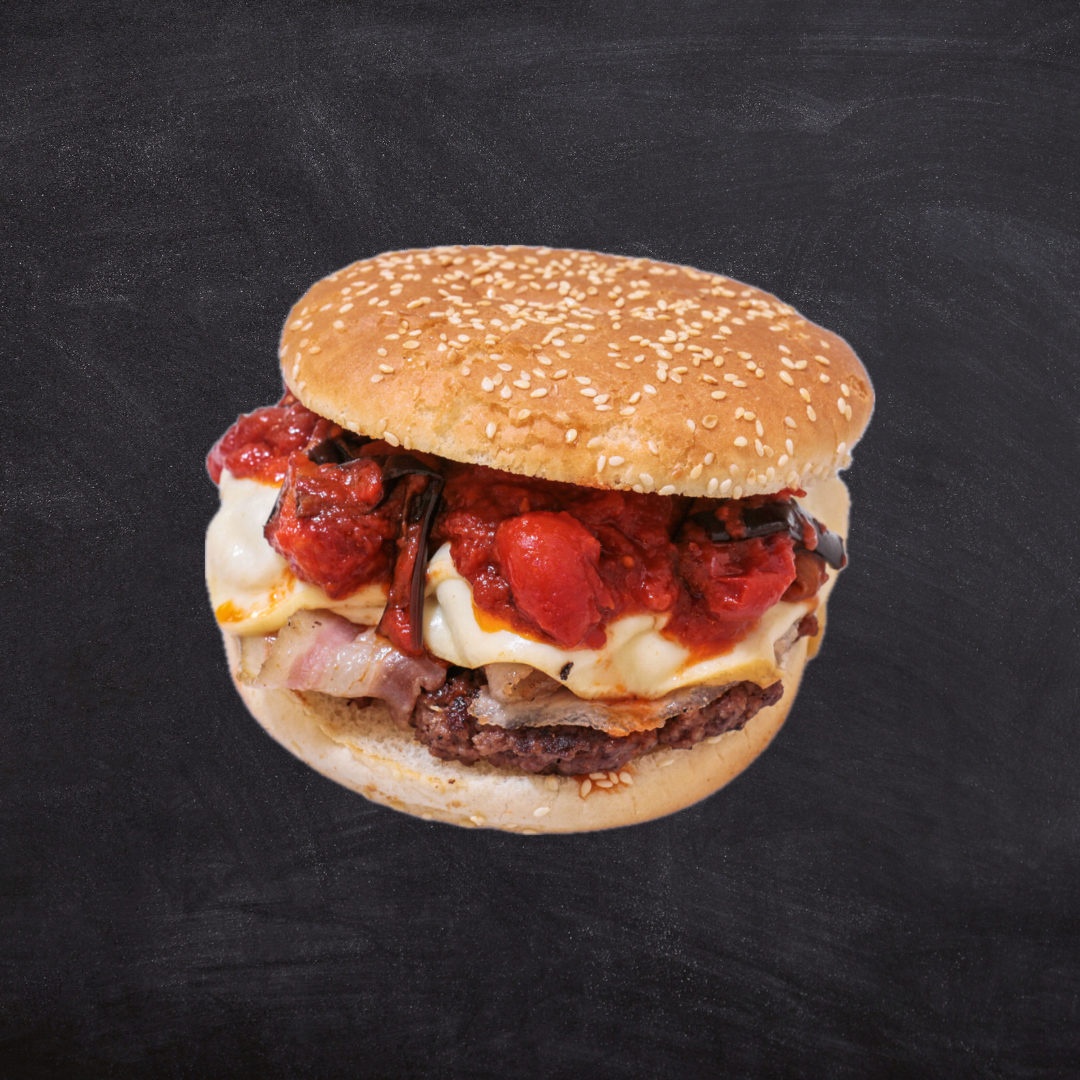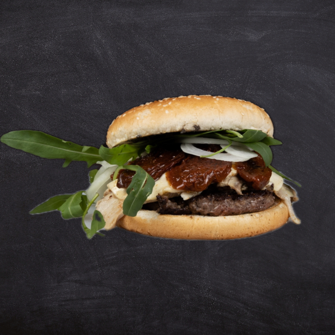 Panino al sesamo, hamburger, porchetta, provola, pomodorini secchi, cipolla fresca, rucola, crema tartufata