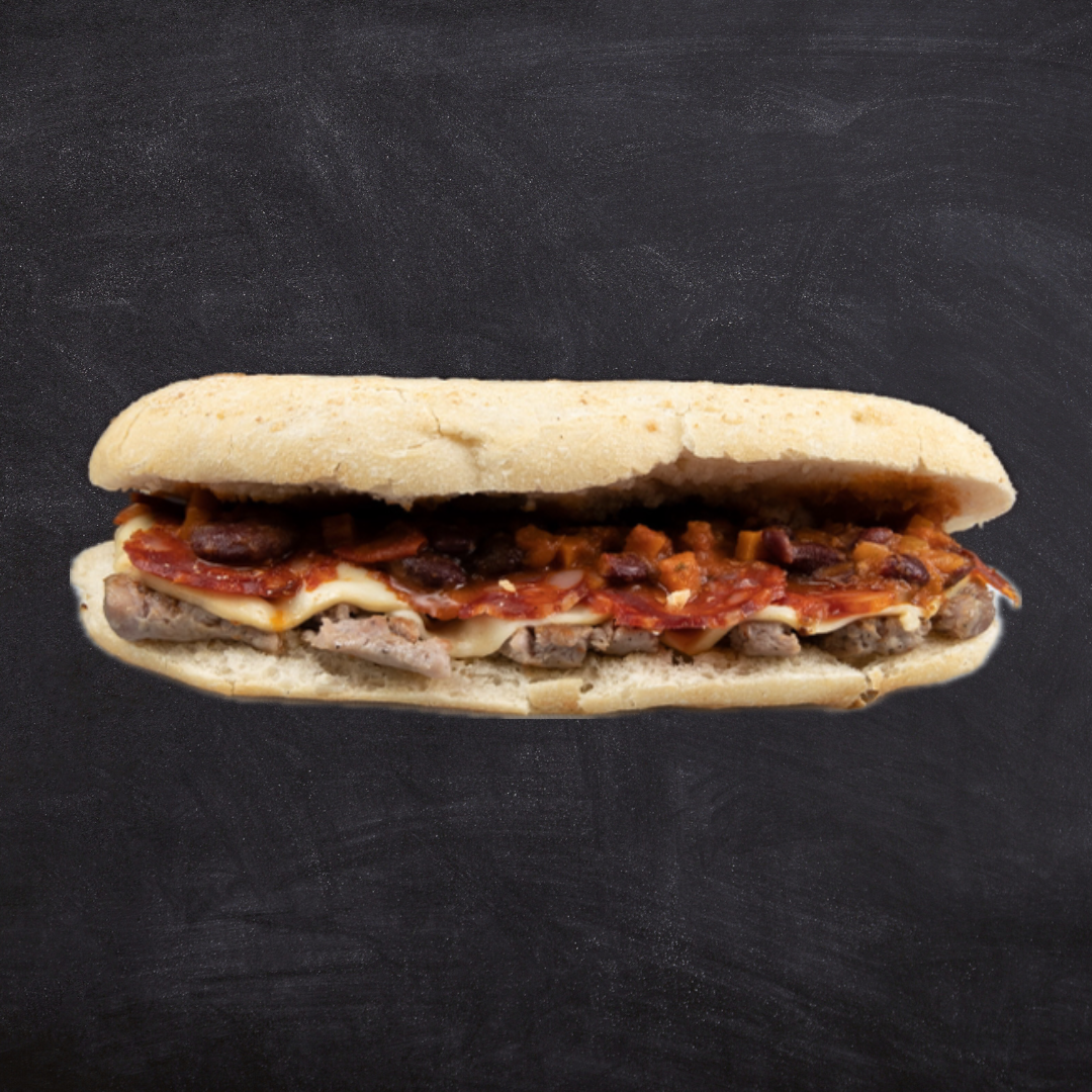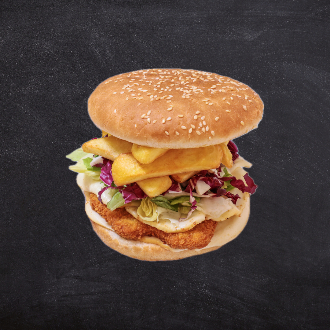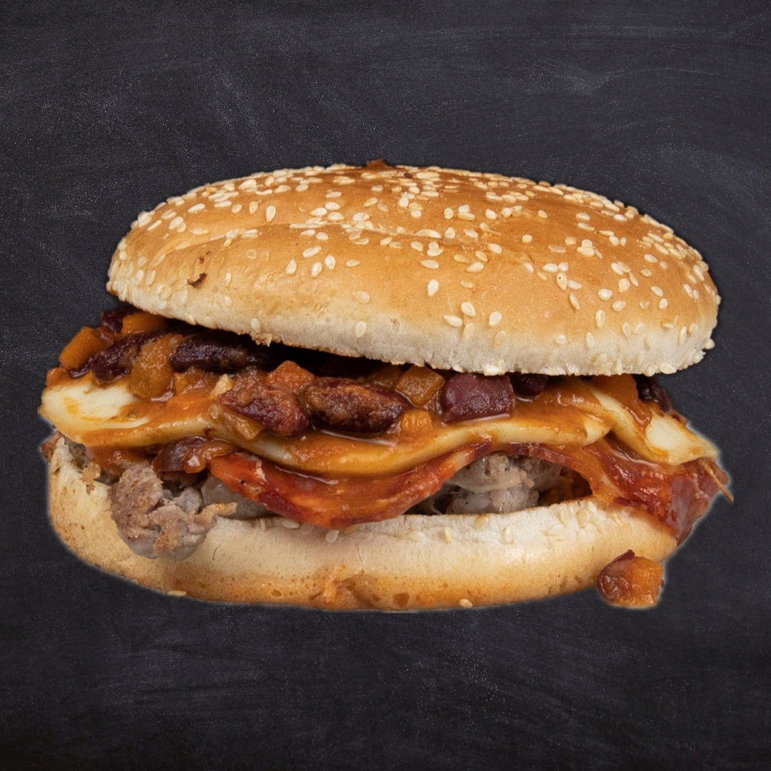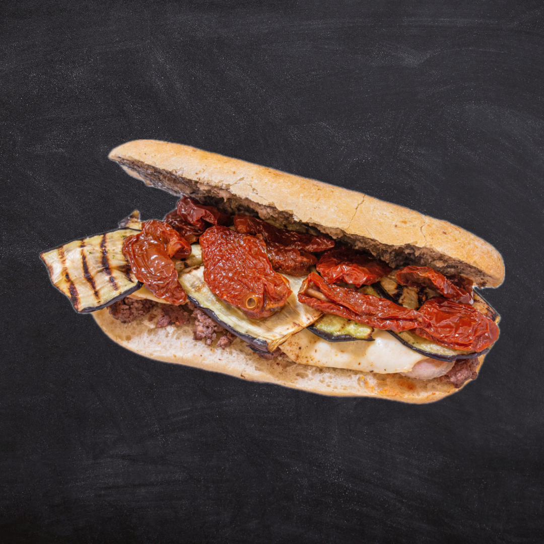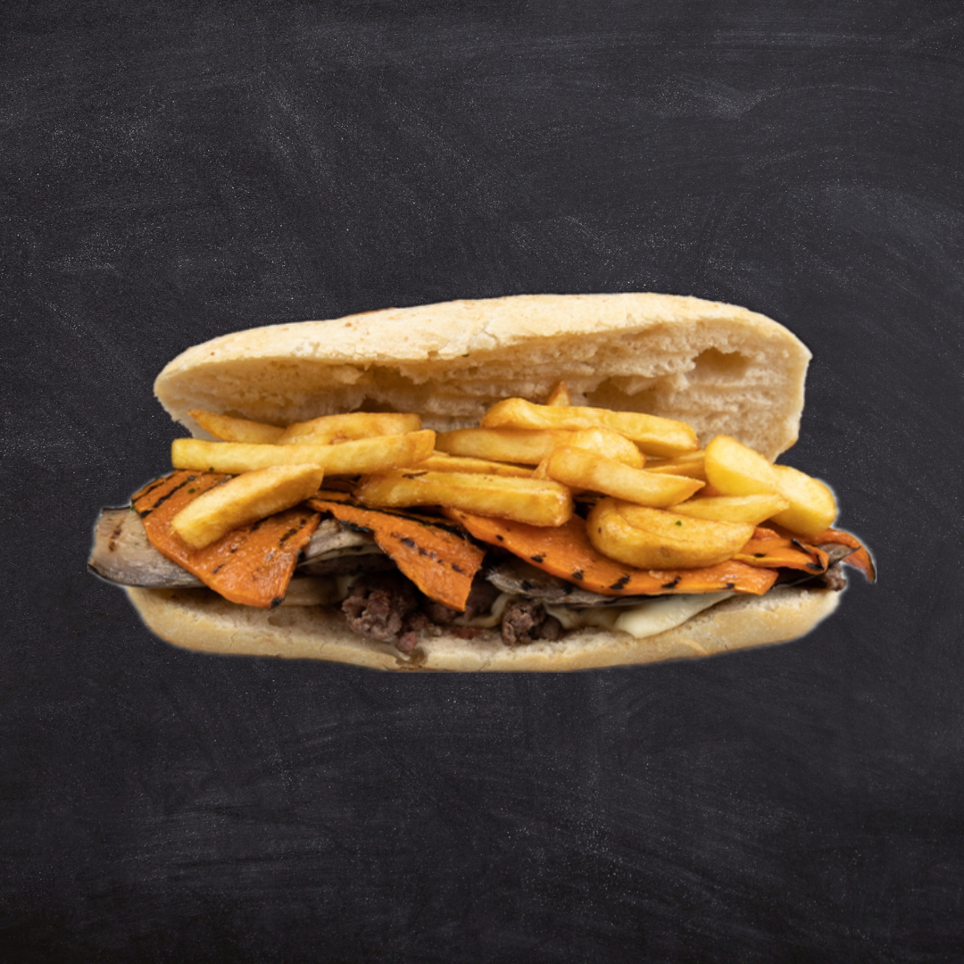 Pane cafone, doppio hamburger, doppia provola, zucca grigliata, melanzane grigliate, patatine fritte