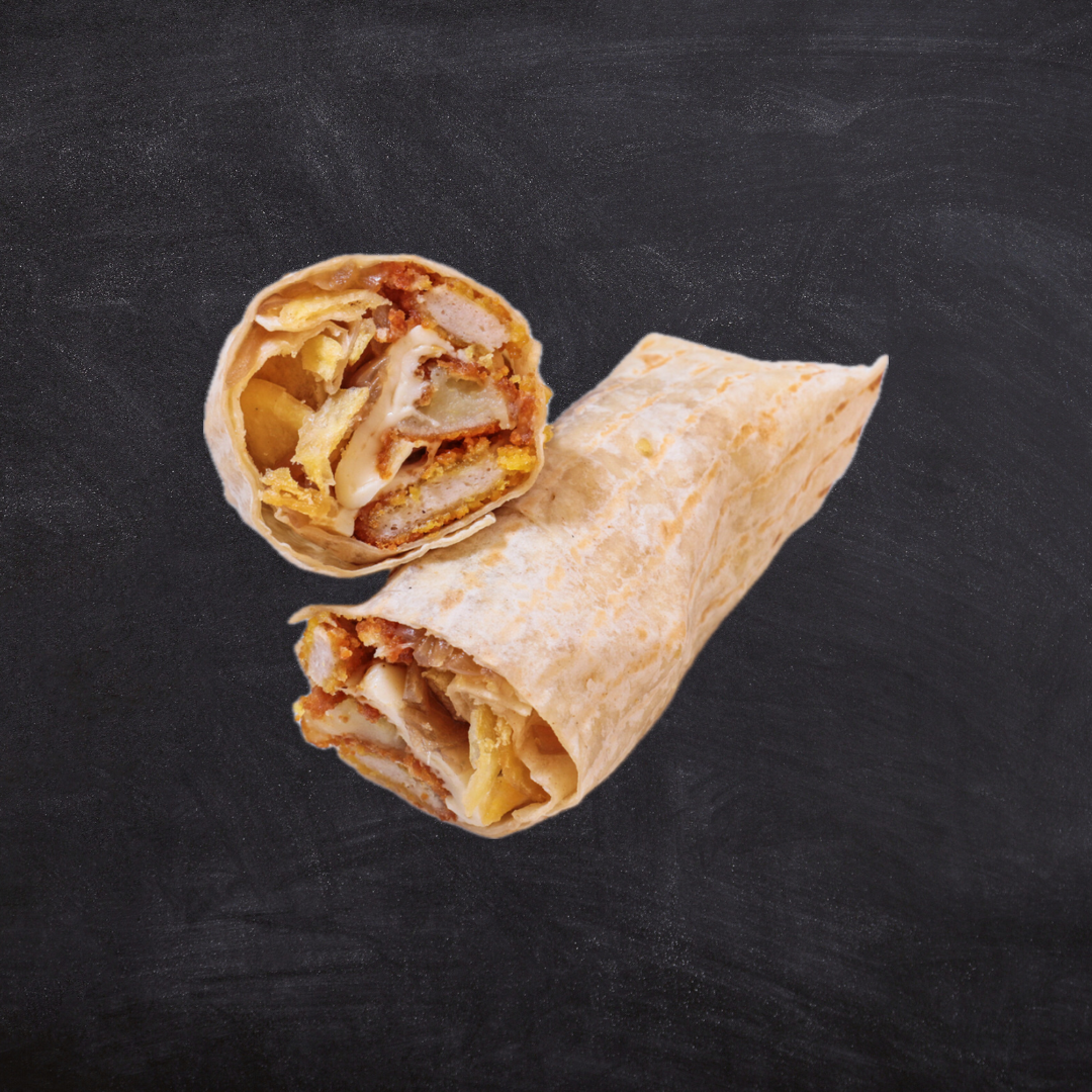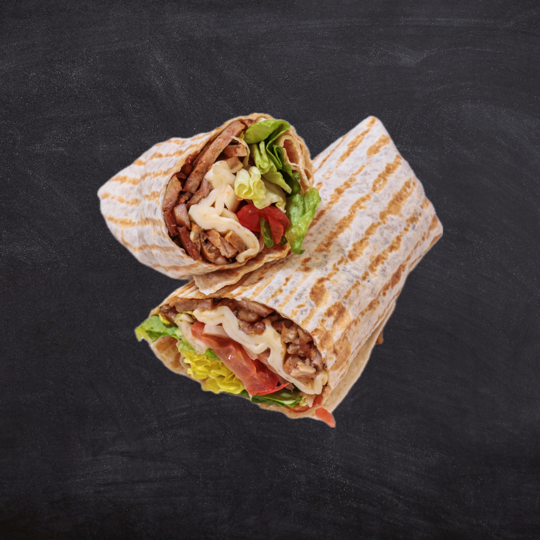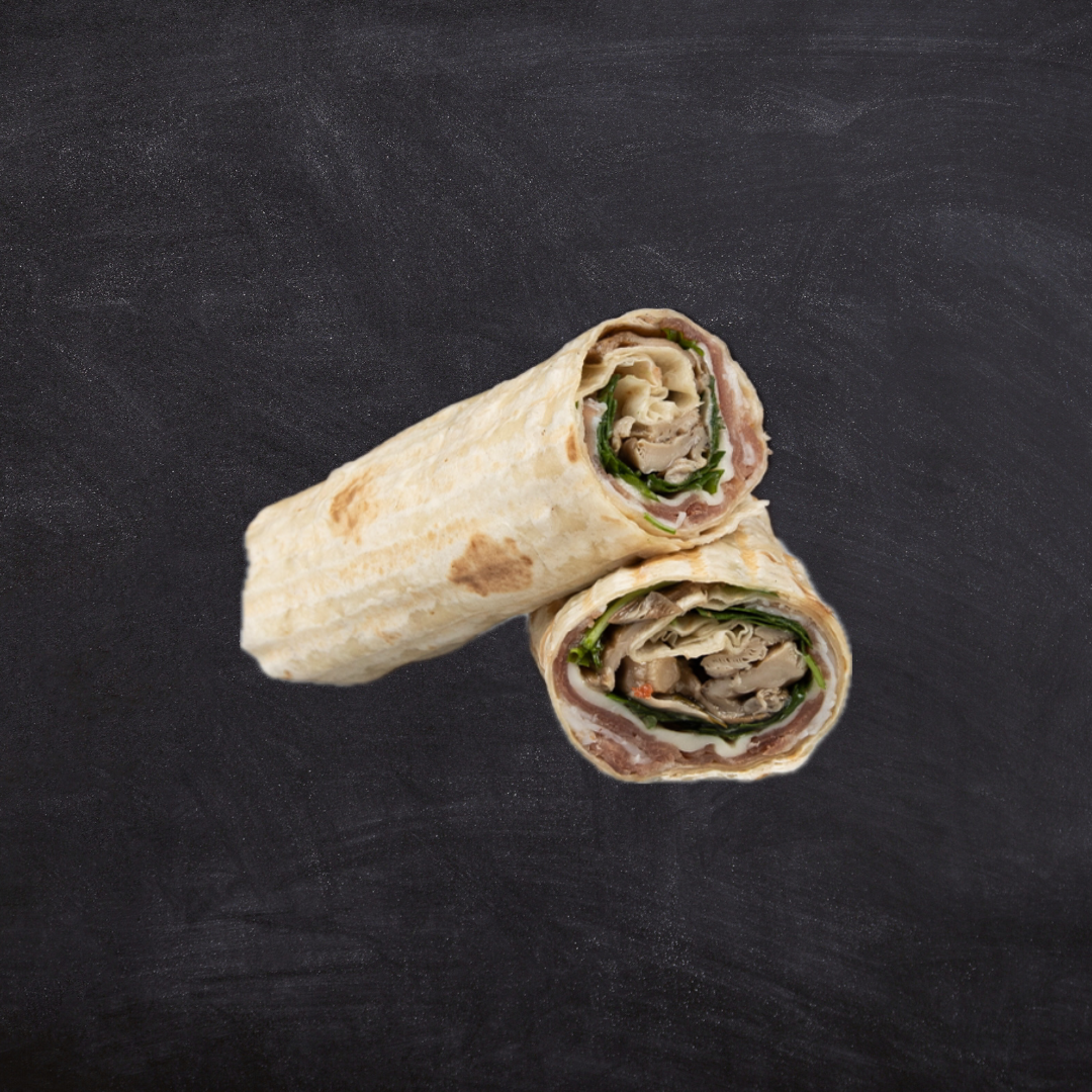 Piadina, hamburger, provola, melanzane grigliate, zucca grigliata, insalata, scaglie di formaggio