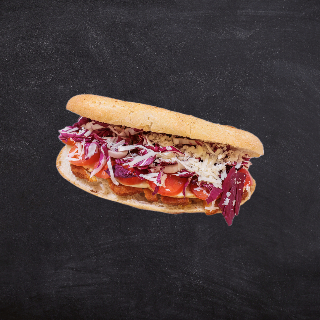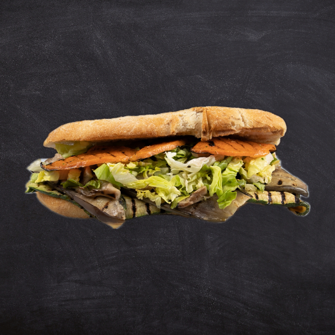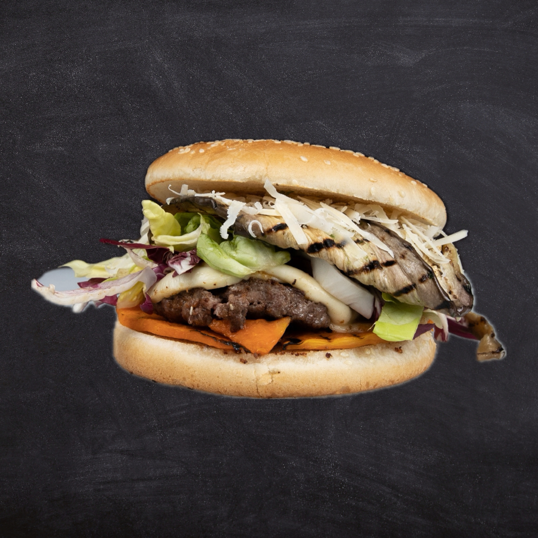 Panino al sesamo, hamburger, provola, insalata, radicchio, melanzane grigliate, zucca grigliata, scaglie di formaggio