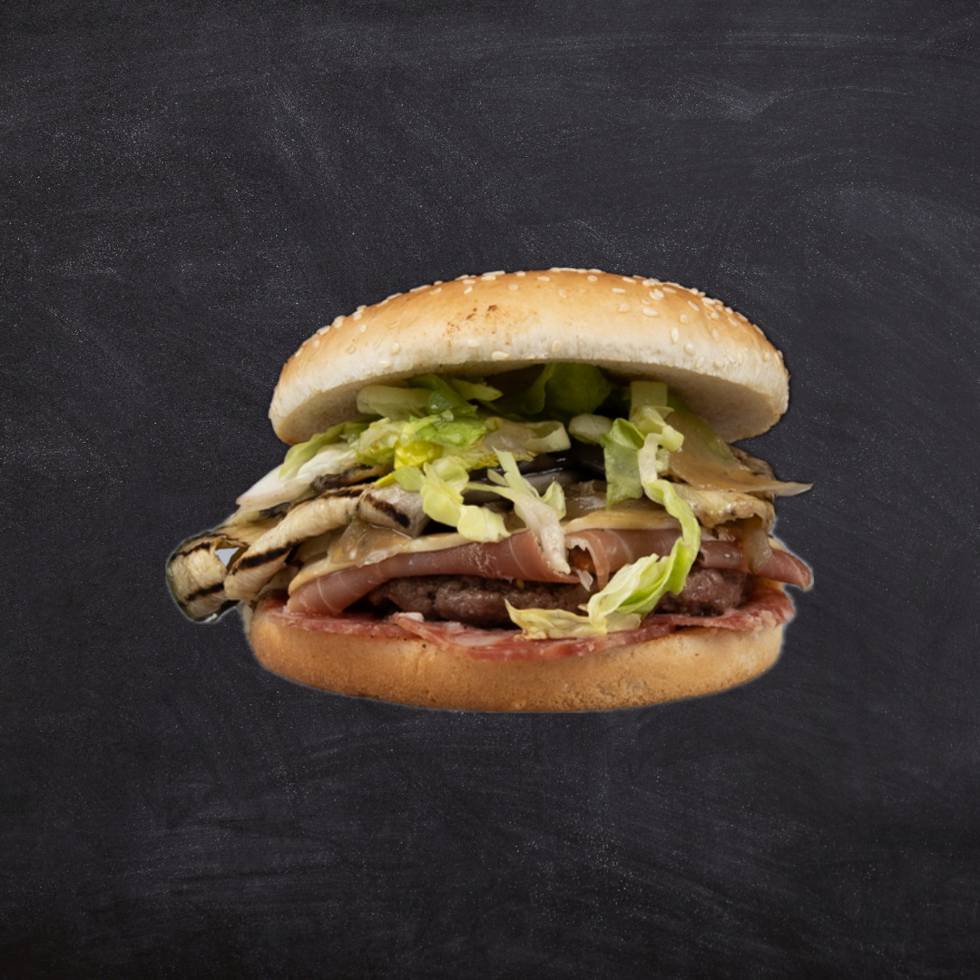Panino al sesamo, hamburger, salame napoli, prosciutto crudo, provola, insalata, melanzane grigliate, cipolla caramellata